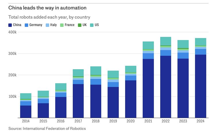Według danych International Federation of Robotics (IFR), w latach 2014–2024 liczba zainstalowanych robotów przemysłowych w Chinach wzrosła z 189 tys. do ponad 2 mln jednostek. W samym 2024 roku wdrożono 295 tys. nowych robotów, podczas gdy w USA ledwie 34 tys., w Niemczech – 27 tys., a w Wielkiej Brytanii jedynie 2,5 tys. Ta różnica ilustruje nie tylko skalę, ale także tempo adaptacji technologii automatyzacyjnych w chińskiej gospodarce.